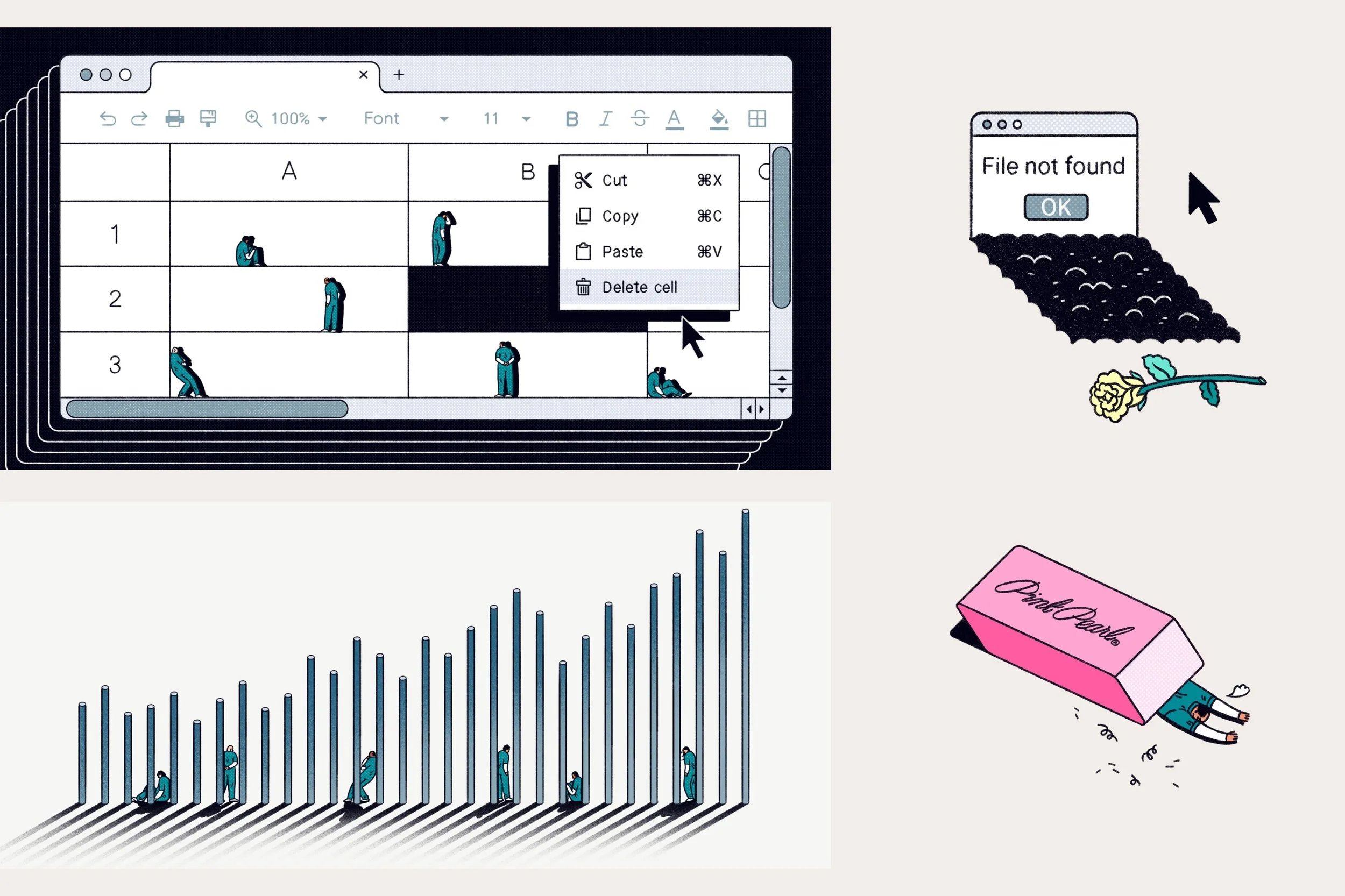 I commissioned illustrator Josie Norton to create two header illustrations to depict the lack of accuracy and transparency in how people die while in prison. Since we were working with data, tables and charts, I wanted the illustrations to be abstract but also on the nose with how people in prisons are impacted.