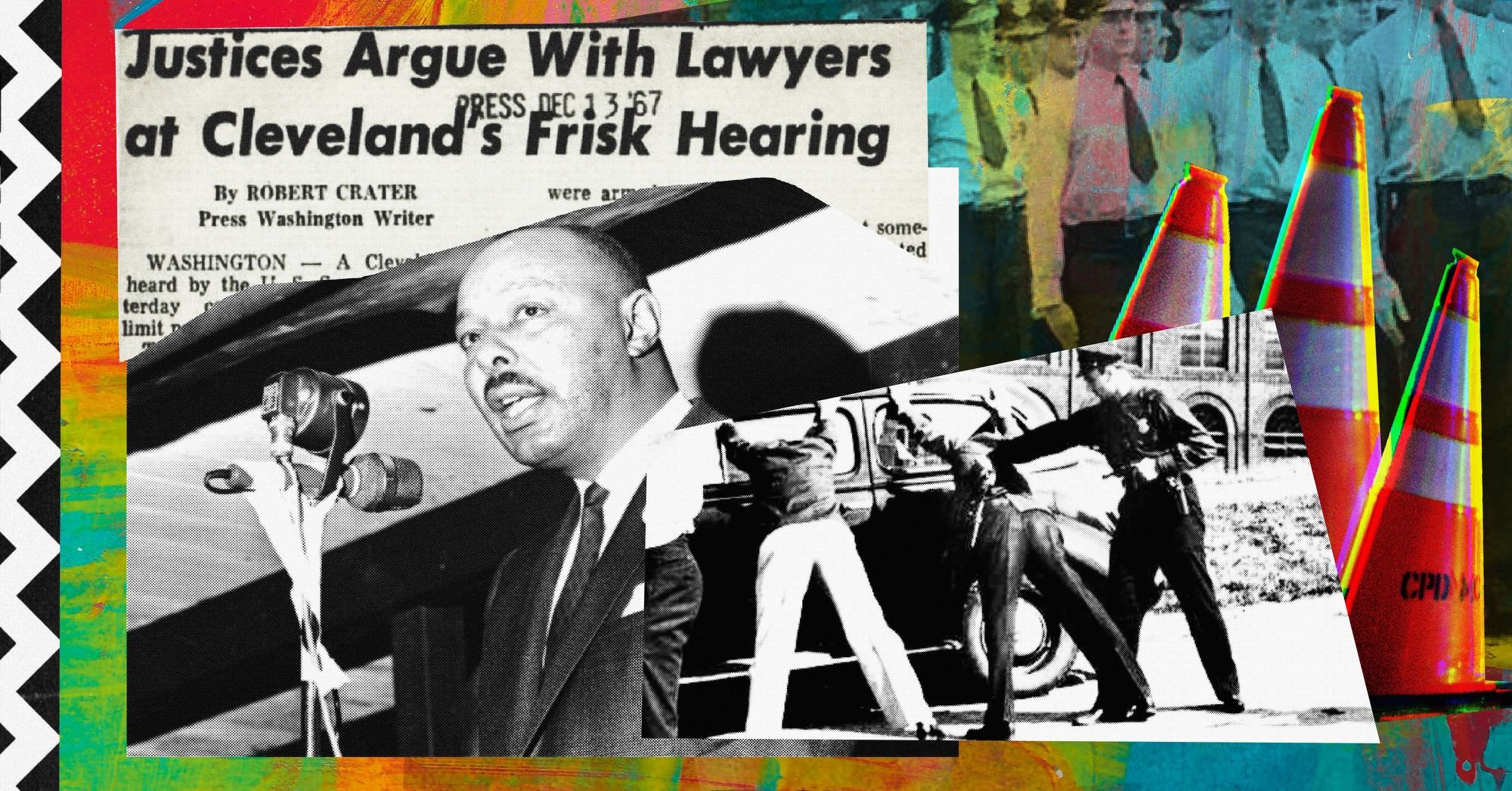 Collage artist Aaron Marin used archival images and his collage style to showcase how a historic case from 1963 in Cleveland impacted Stop-and-Frisk tactics in US policing.